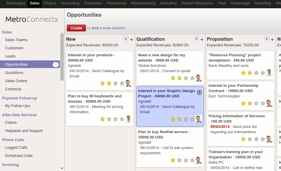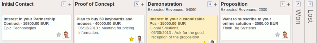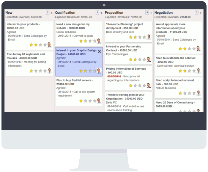 Track your opportunities pipeline with the revolutionary Kanban view in a few simple steps. Work inside your sales funnel and get instant visual information about next actions, new messages, top opportunities and expected revenues.