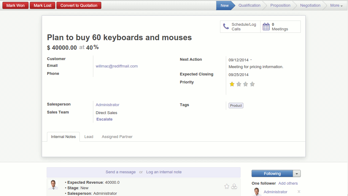 Organize your opportunities so you can stay focused on the best deals. Manage all customer interactions from the opportunity like emails, phone calls, internal notes, meetings and quotations.