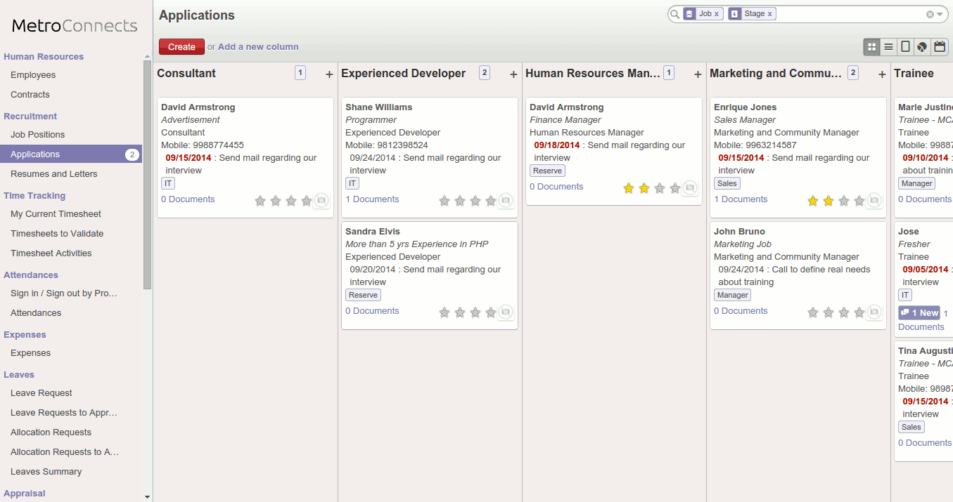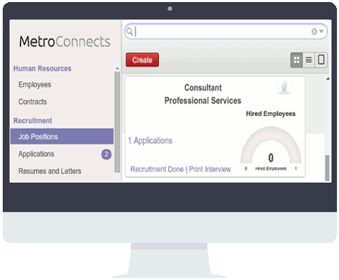 Create your own hiring strategies - MetroConnects solutions for recruitment software offer great service for big as well as for small business. Use the Kanban view and customize the steps of your recruitments process: pre-qualification, first interview, second interview, negotiation, ...